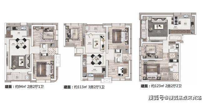 公寓:47㎡单房 86-94㎡2房,113㎡3房,115-125-160㎡2房202㎡3房,220㎡3+1房