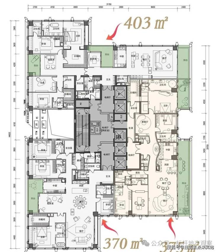 建面约500-700㎡,以及1050㎡顶奢大平层