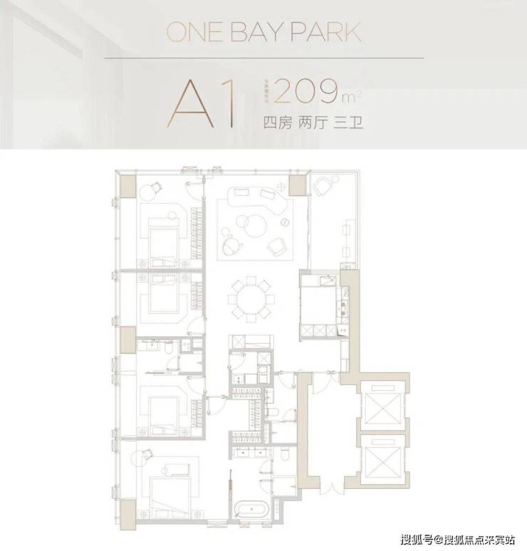 核心参数:5梯4户双梯入户,私属电梯前厅;奢阔横厅设计,客餐厅开间8.5米,面积约50㎡,空间开阔大气;三开间朝南,南北通透格局,270°环幕飘窗设计,部分中高楼层房源可享海景;主卧套房设计,面积约35㎡,配备独立豪华卫浴(双台盆+浴缸+淋浴)、步入式衣帽间及全景飘窗;其余卧室均为舒适尺度,部分为套房设计,保障家人居住私密性;豪华中西双厨设计,配备西门子等国际一线品牌电器;户户带超20㎡空中庭院,实现“推窗见绿”体验;精装交付,东南或西南朝向,支持209㎡户型三房/四房个性化布局调整。