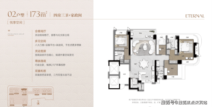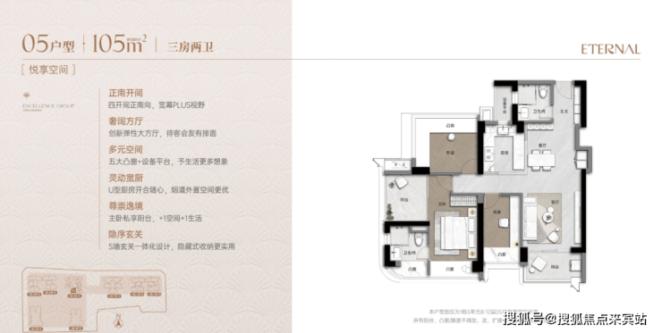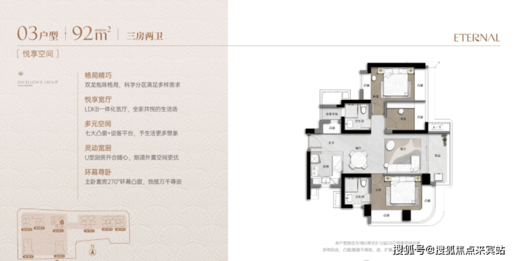 超高使用率90%+:通过“弹性方厅”(可变空间)、设备平台外拓、多飘窗实现。