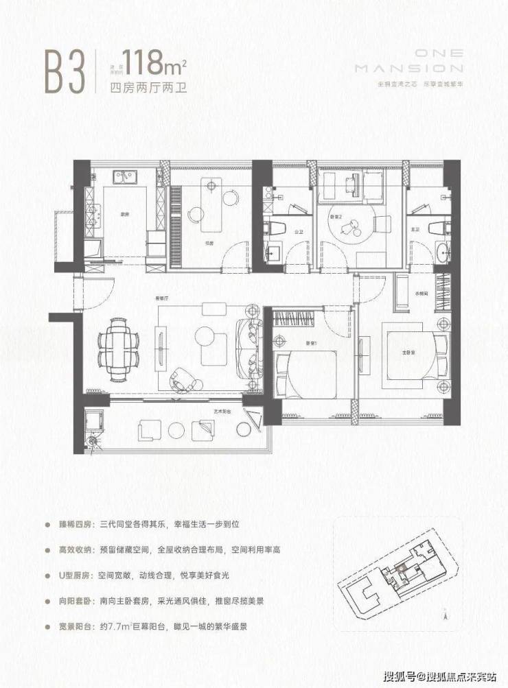 设计的横厅南北通透格局,客餐厅4.2米开间,全屋飘窗设计,四开间朝南,4个卧室分别做到了3.2米/2.9米/2.9米/2.7米的宽度,U型厨房,约7.7米长超大阳台,得房率72.47%(不含赠送),阳台主朝东南向。