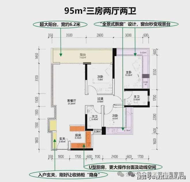 95㎡的3房2厅2卫,设计的是竖厅格局,客厅3.5米开间,LDKB一体化,S墙设计预留冰箱卡槽位,3个卧室分别做到了3.6米/2.8米/2.8米的宽度,主卧加1个次卧270°全景飘窗,客厅连接次卧出6.3米长的大阳台,U型厨房,得房率约95-97%(包含赠送),西南或东北朝向。