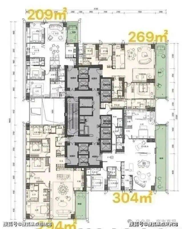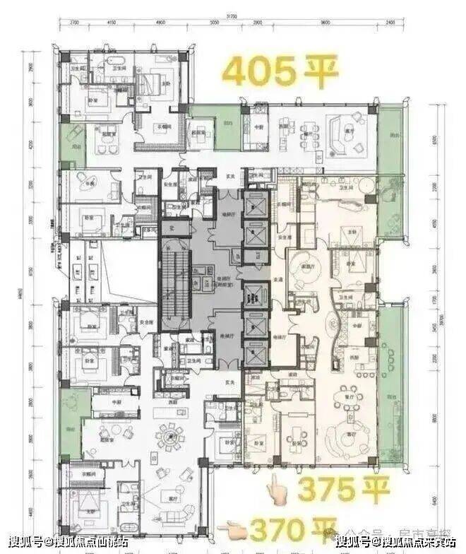 超高区(58层起,200米以上):约500-700㎡顶级大平层。