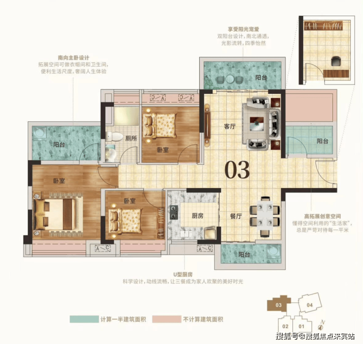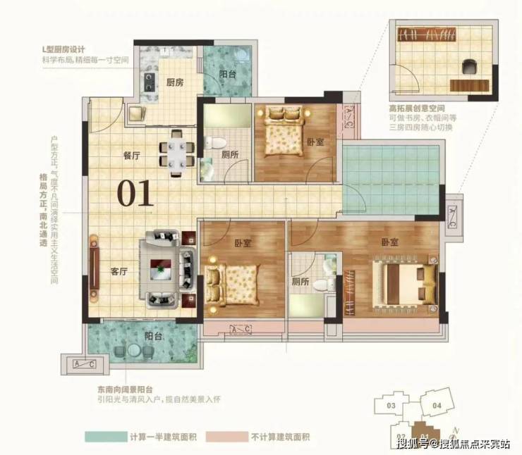 再来看看03户型,约102m²3+1房2厅1卫,与01户型不同的是,该户型实用率能到达97%,且为双阳台设计,四开间朝东南,通风、采光性更加好。