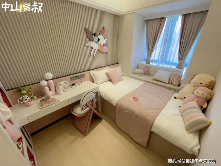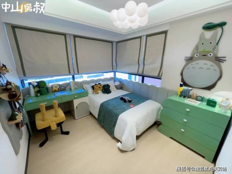 另一个次卧更是惊艳,一进门180°的全景飘窗展示在眼前,小朋友若能在这样的阳光房成长,怎能不阳光?