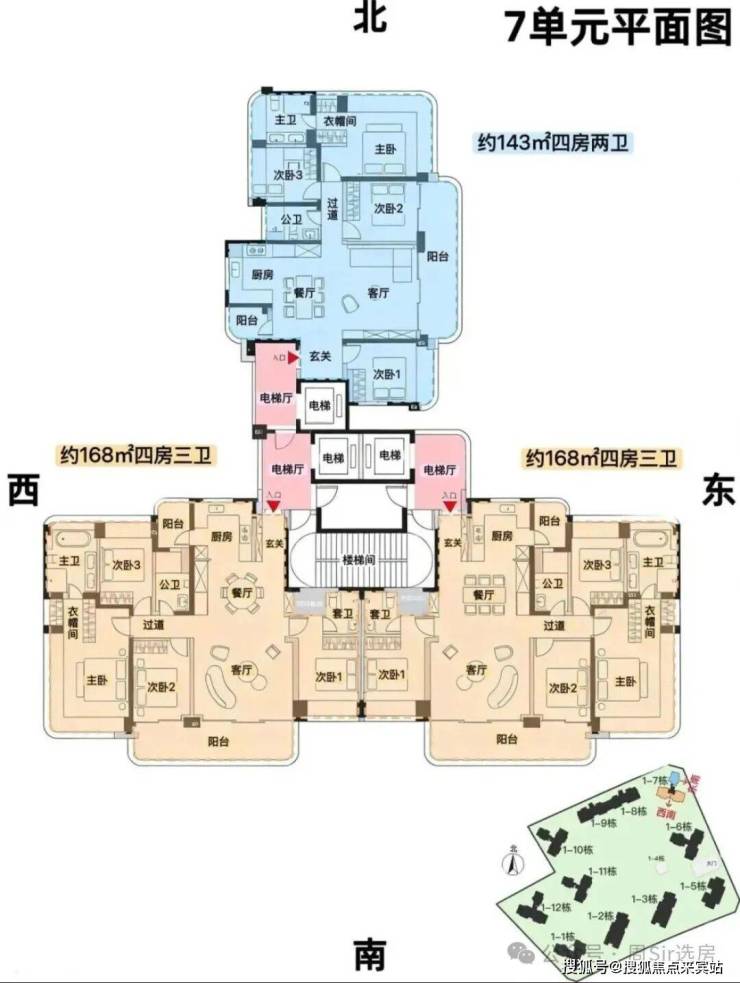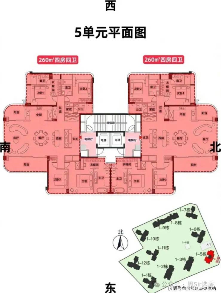 项目采用围合式点式错位布局,2T2户(板楼)和3T3户(塔楼)相结合的设计,确保了户户朝南的优质采光和通风条件。其中,2/3/5/8/9栋为2T2户板楼,产品面积段为193-253-332㎡的大平层;1/6/7/10/11/12栋为3T3户塔楼,产品面积段为140-168-190㎡的4房。这种设计既保证了户型的稀缺性和高端性,又满足了不同客群的需求。