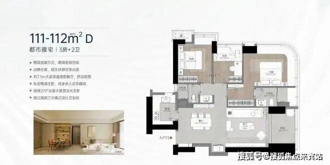【111-112㎡ 3房2卫】D户型:经典竖厅户型,东南朝向 (02、03)看城市景观