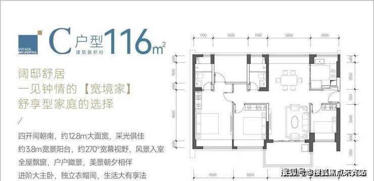 116㎡的4房2厅2卫,C户型,设计的是竖厅南北通透格局,餐客厅一体化设计,客厅3.8米开间,四开间朝南,4个卧室分别做到了主卧17.85㎡/次卧11.4㎡/次卧9.3㎡/次卧8㎡(包含墙体飘窗),都不用搭配飘窗做床,U型厨房,卫生间干湿分离,得房率约:93.13%(包含赠送),阳台主朝西南、东南或正南向。