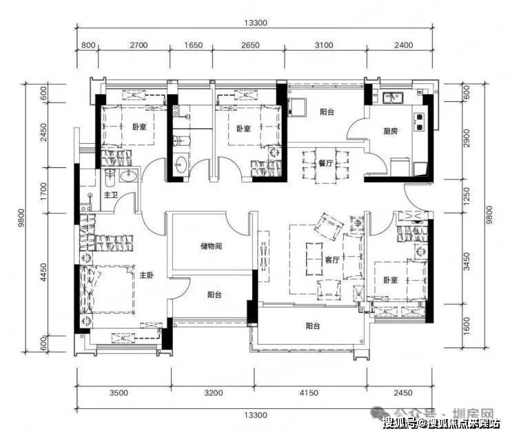 89㎡四房两厅两卫,同等面积多一间房,二孩家庭也能三代同堂。