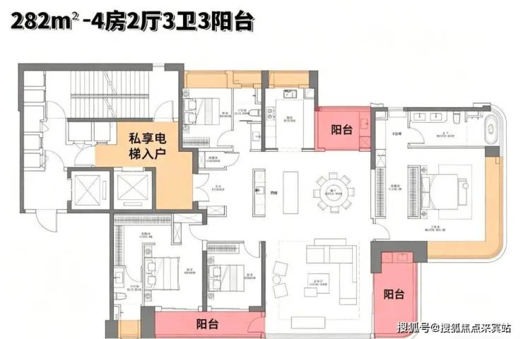 282m²的4房2厅3卫3阳台,设计的是竖厅格局,得房率约90.6%(包含赠送),不含电梯入户,南北双阳台,小阳台看大运公园山景,大阳台东南朝向,俯瞰整个大运中心。