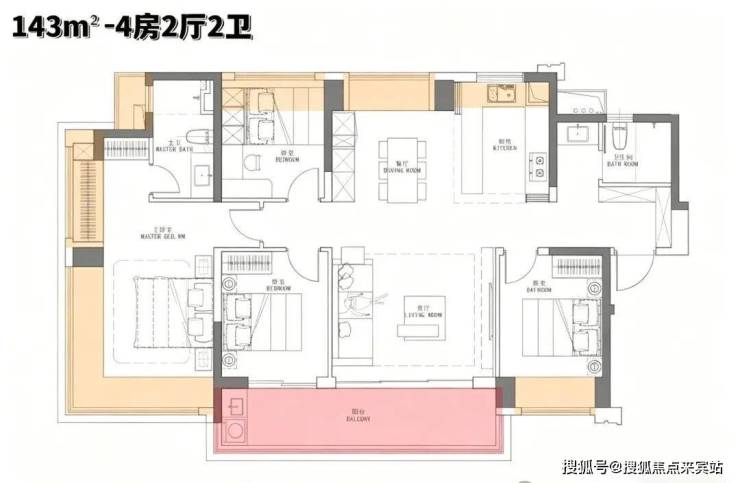 143m²的4房2厅2卫,设计的是竖厅南北通透格局,得房率约92.2%(包含赠送),客厅连接次卧出7.4米长的观景大阳台,全部主朝东南向,看大运中心+大运公园景观。