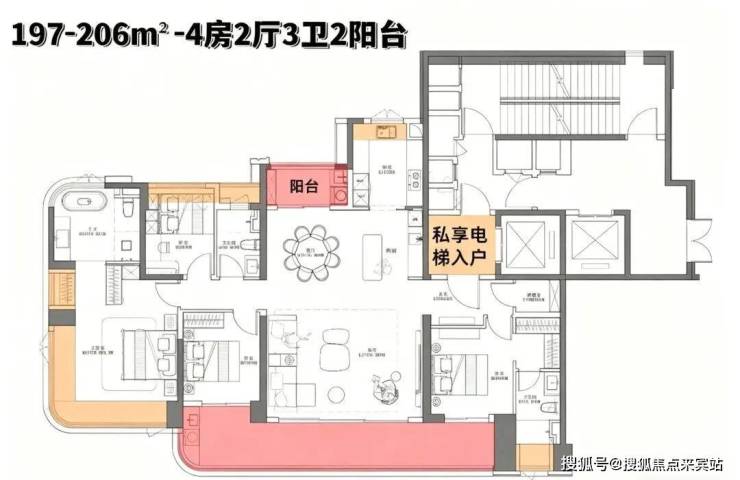 197-206m²的4房2厅3卫2阳台,设计的是竖厅格局,得房率约94.6%(包含赠送),不含电梯入户,南北双阳台,小阳台看大运公园山景,客厅连接2个次卧出超大观景大阳台,东南朝向,俯瞰整个大运中心。