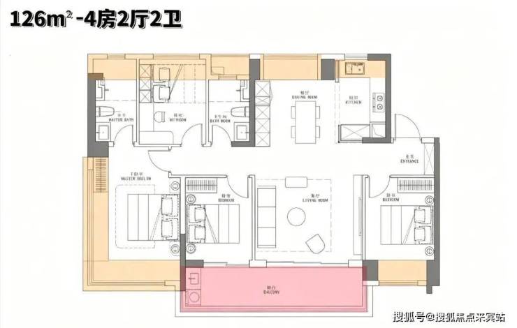 126m²的4房2厅2卫,设计的是竖厅南北通透格局,得房率约95.2%(包含赠送),客厅连接次卧出7.1米长的观景大阳台,全部主朝西南向,看大运公园景观。