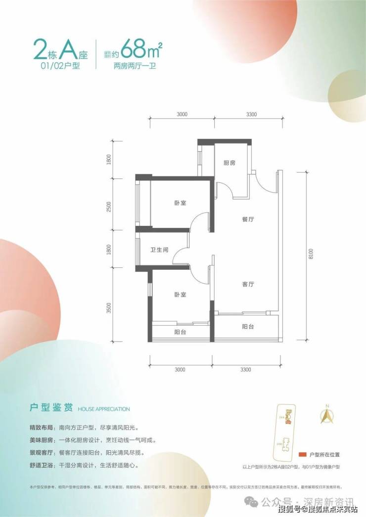 68㎡的2房2厅1卫,2栋A座01.02户型,设计的是竖厅格局,客厅3.3米开间,2个卧室分别做到了主卧10.5㎡/次卧9㎡(包含墙体飘窗),得房率约74.05%(不含赠送),朝正南向。