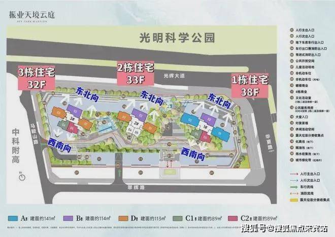 共 3 栋住宅(32-38 层),规划 480 户(商品房 375 套、公租房 71 套、自持租赁 34 套);1/3 栋 3 梯 5 户,2 栋 2 梯 5 户。