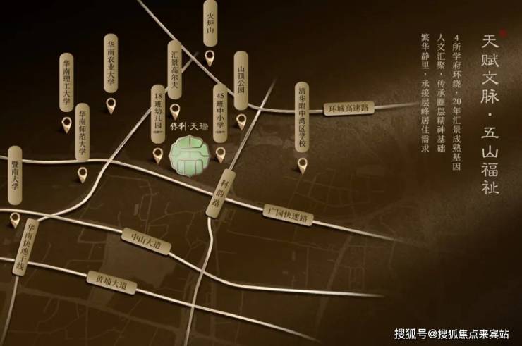 项目位于天河五山汇景新城板块内,珠江新城和琶洲金融城两中轴间的核心位置,楼盘身后就是汇景20年醇熟的圈层配套。