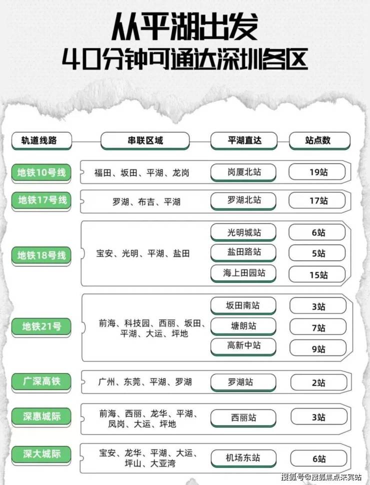 深圳布局了14个综合交通枢纽,平湖站升级为深圳的8个高铁枢纽之一,“1高铁、2城际、3地铁、4快速路”的配置,让平湖枢纽跻身为继福田、罗湖口岸、深圳北站之后的深圳第四大交通枢纽中心(平湖白泥坑还规划有深大城际线路)。
