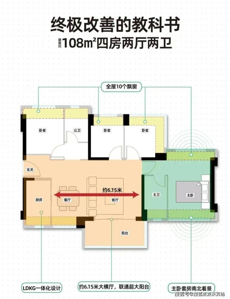 108㎡的4房2厅2卫,设计的是横厅南北通透格局,进门独立玄关,客餐厅6.4米开间,LDKB一体化,五开间朝南,主卧双飘窗通透设计,全屋10个凸窗,4个卧室分别做到了主卧17.01㎡/次卧9.7㎡/次卧8.4㎡/次卧7.35㎡(包含墙体飘窗),L型厨房,卫生间干湿分离,得房率约91.88%(包含赠送),阳台主朝西南或东南向。