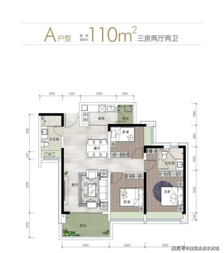 ●110-115㎡3房:双阳台,主卧套间设计,二胎家庭或三代同住无压力,得房率87%-89%(碾压同面积段竞品),不过110平A户型进门就是洗手间,洗手间门口对着餐厅的位置,这个户型需要注意,介意的慎选。