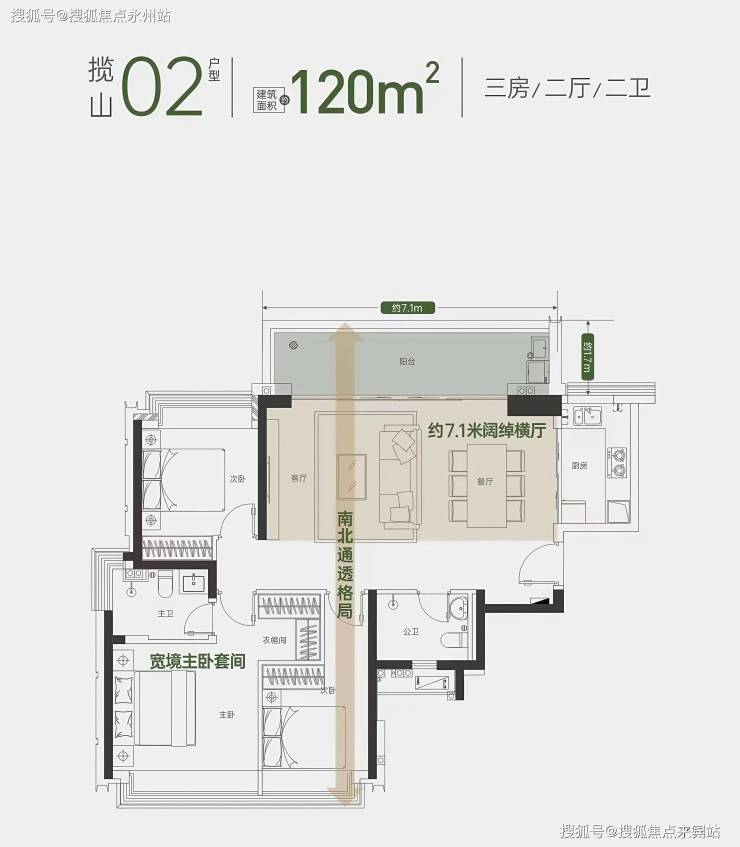 03户型 约120㎡3房2卫:双龙抱珠户型,三开间朝南,双阳台设计,该户型为正南朝向,户型方正,双阳台,三开间朝南,能实现三面宽采光“双龙抱珠”设计的居住格局,中庭为厅,主客卧分布于客厅两侧,在提高空间利用率的同时,也能显著提高居住的私密性,主卧套房设计,带观景浴室,双阳台设计,主阳台进深约1.5米观景阳台,拥有270°向外视野景观,俯瞰安托山,生活阳台连接双面操作厨房,还能看塘朗山景观。