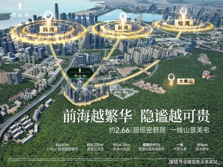 观山海家园位于深圳南山前海大南山脚下,兴海大道与沿山路交汇处,由远洋集团(深圳市远荔实业有限公司)开发。项目占地约4.2万㎡,总建面约16.3万㎡,容积率仅约2.65,是前海片区罕见的低密度纯商品房社区。项目规划12栋17-25层小高层住宅,总户数870户,主力户型为95-138㎡的3-4房,层高3-3.05米,物业费6.8元/㎡/月,预计2026年12月30日精装交付。