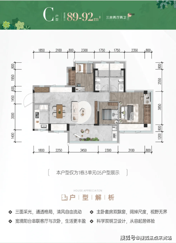 户型方正,动静分离,南北通透,设置宽阔景观阳台,视野开阔,房间布局兼具实用性与美观性,完美适配三代同堂生活。