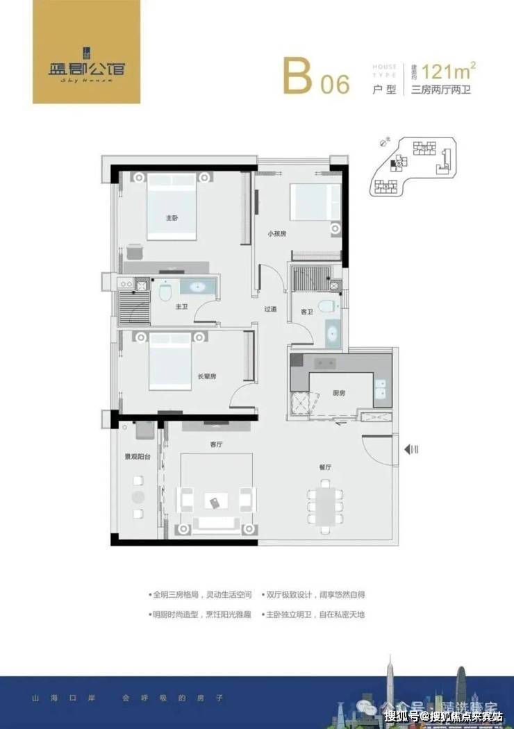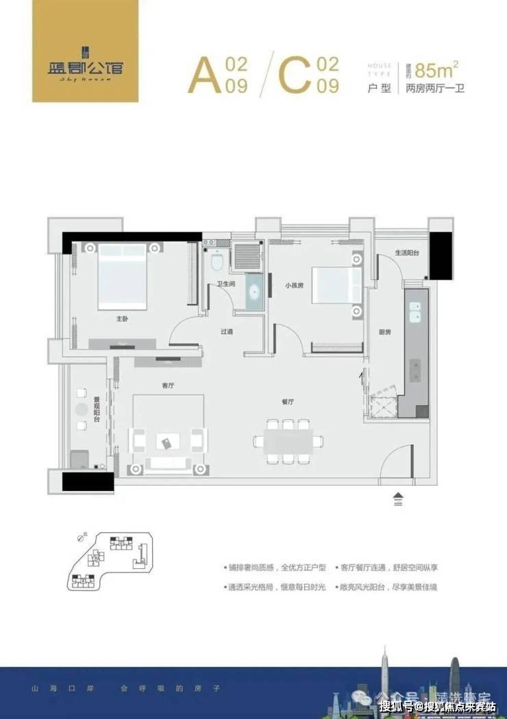 主宾分区,动静分区;端头户型,双面采光;双阳台设置,客厅紧连景观阳台,可观山海。
