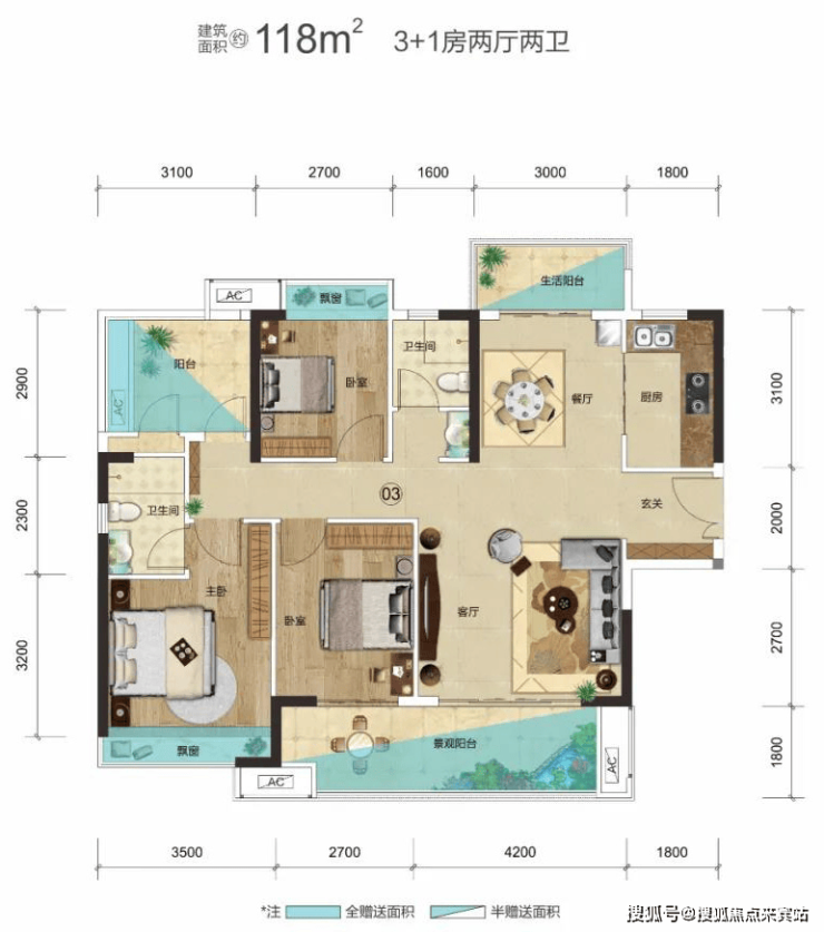 建面约118㎡4房户型的亮点:约6.9米大阳台、主卧套间、270°景观房; 奢阔4房设计,南北对流双阳台设计,朝南6.9米大景观阳台瞰景;主卧舒适套间+270°景