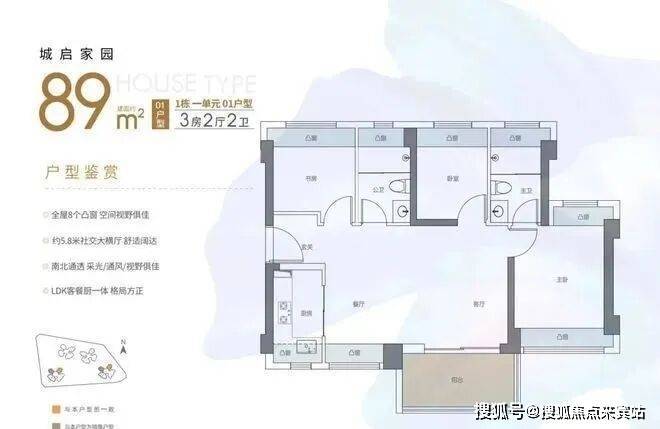 西南或东南向,户型是横厅南北通透格局,客餐厅5.8米开间,主卧双飘窗南北通设计,8个飘窗加阳台使用率在90%左右。