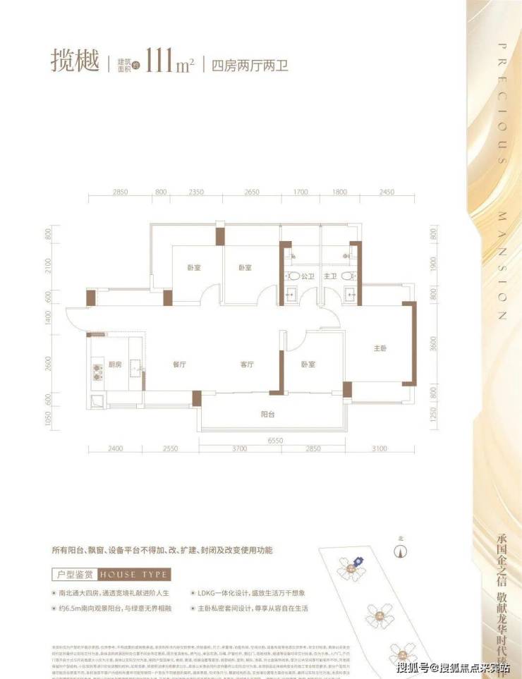建面约111㎡的四房两卫户型,采用横厅南北通透格局,独门独户。