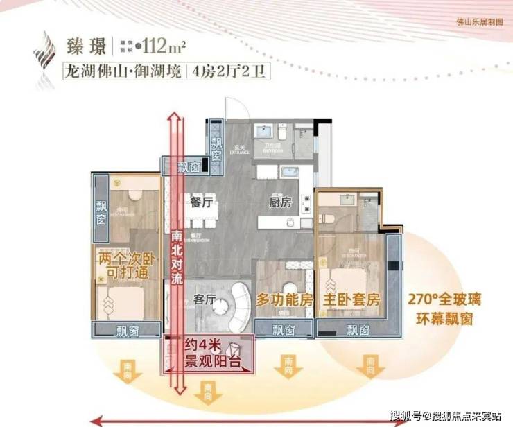 112㎡户型,四南向开间,直面中心园林,长达约13.6米的南向面宽保证了极佳的景观视野,主卧同样标配270°全玻璃环幕飘窗,实现无死角观景效果。