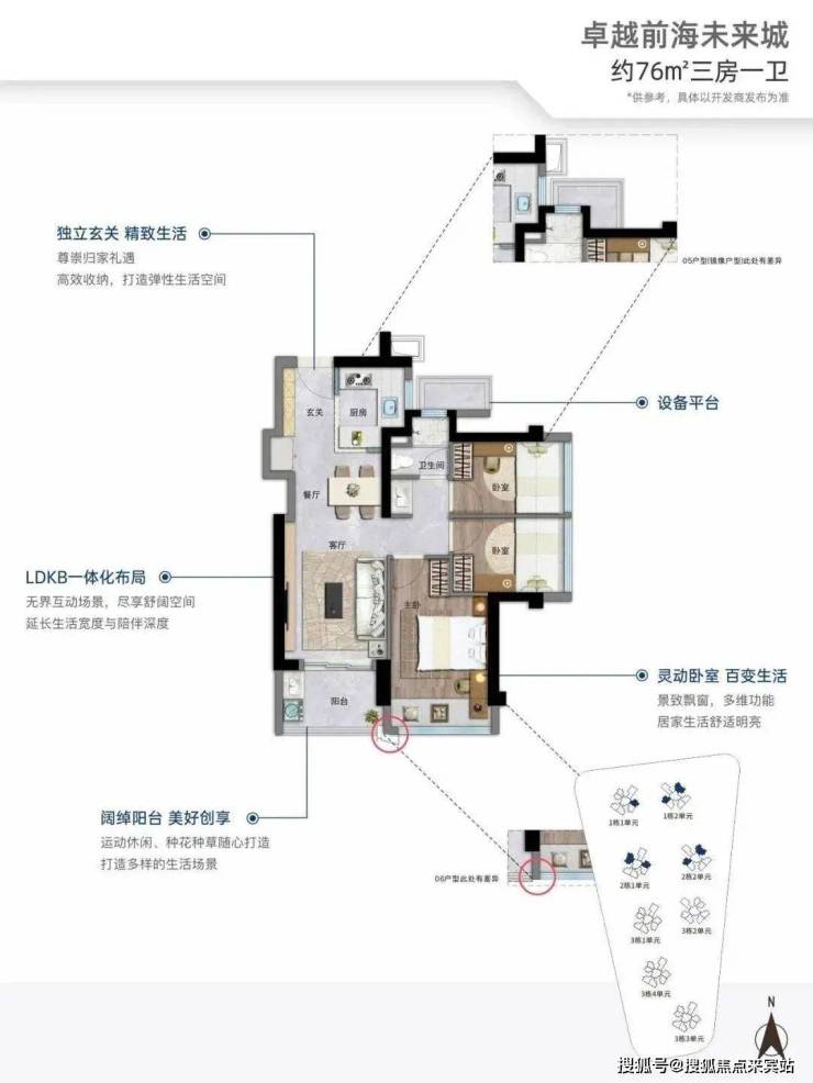 76㎡的3房2厅1卫,设计的是竖厅格局,进门入户玄关,客厅3.05米开间,LDKB一体化,S墙设计预留冰箱位,3个卧室分别做到了2.95米/2.3米/2.15米的宽度,U型厨房,卫生间三段式分离,还带1个设备平台可以使用,得房率约:89%(包含赠送),阳台有朝东北、东南或西南向。