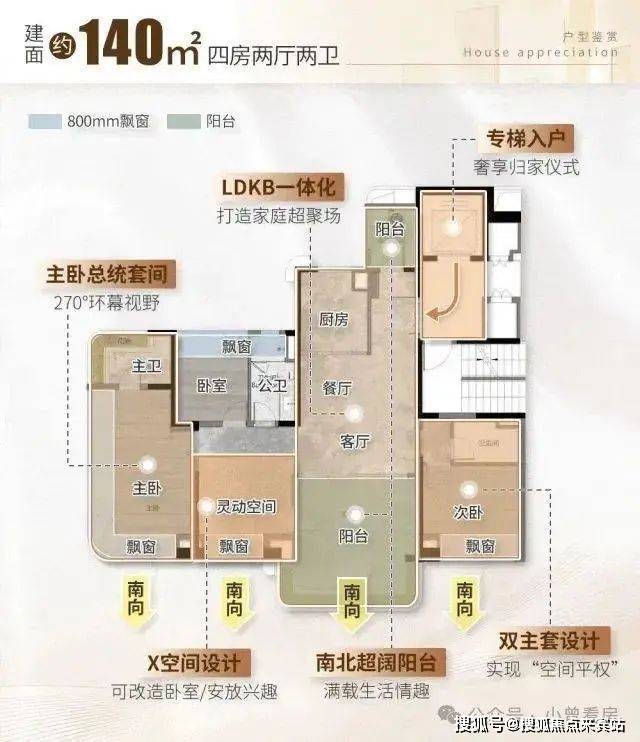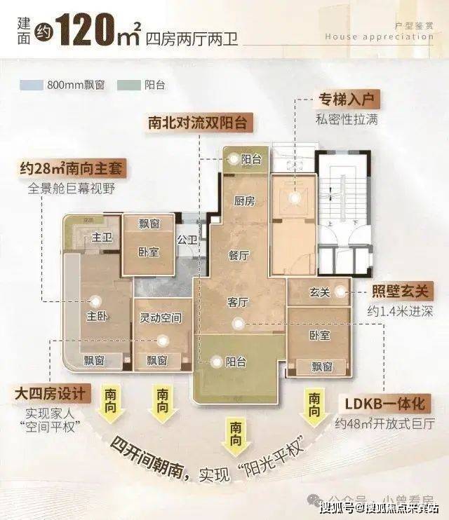 120㎡四房:南向四开间,约 6 米阳台,主卧 270° 全景舱,适合预算 800 万级的刚改家庭;