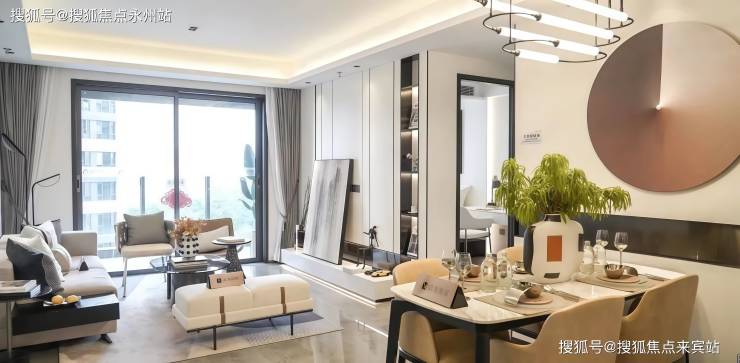 阔绰横厅设计:客厅开间5.2米,可容纳8人餐桌+3.8米沙发,空间感媲美140㎡户型,适合家庭聚会和商务接待。