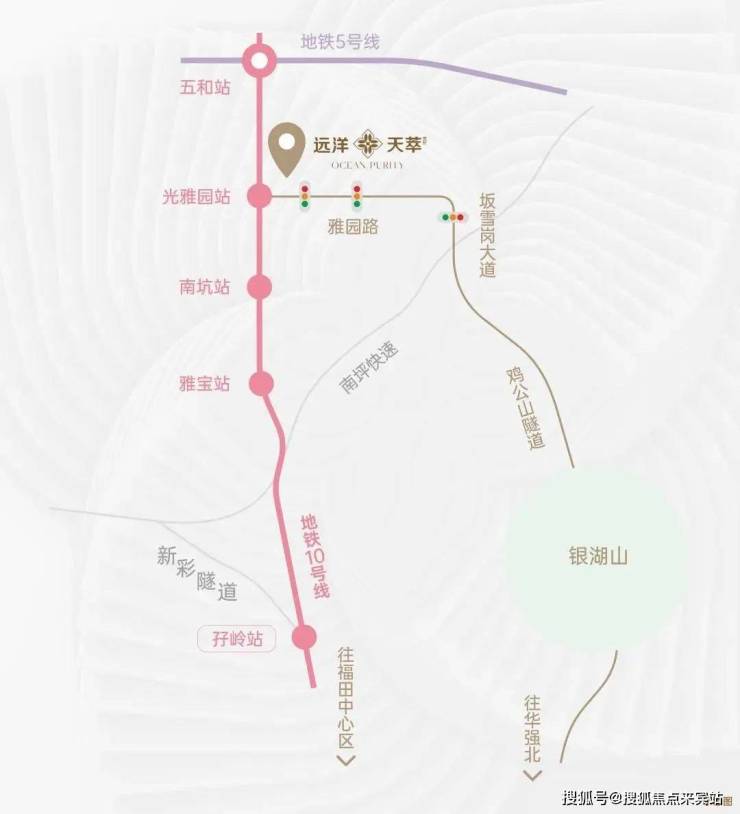 项目交通十分便利,楼下的光雅园站有地铁坂田线(10号线),南北走向通达福田至龙岗平湖,当中路过福田中心、华为一带产业聚拢区都是不少大厂人的通勤必经之路,还能直达福田口岸到香港。1站到五和枢纽站可换乘环中线(5号线)/ 深大城际,3站到贝尔路站可以转25号线,4站直达华为站。2站到坂田最大商业核心区星河World,3站到福田梅林,6站到福田岗厦北枢纽。