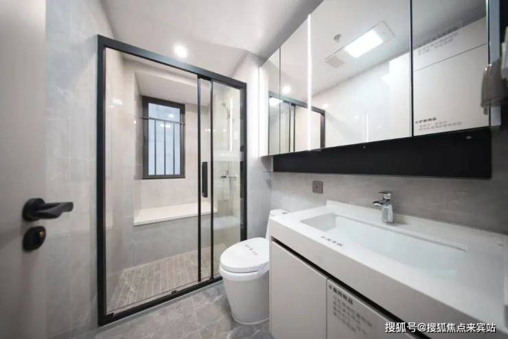 卫生间,还参考星级酒店做法,通过多功能镜柜,分层收纳;马桶侧预留收纳柜,方便起居使用。