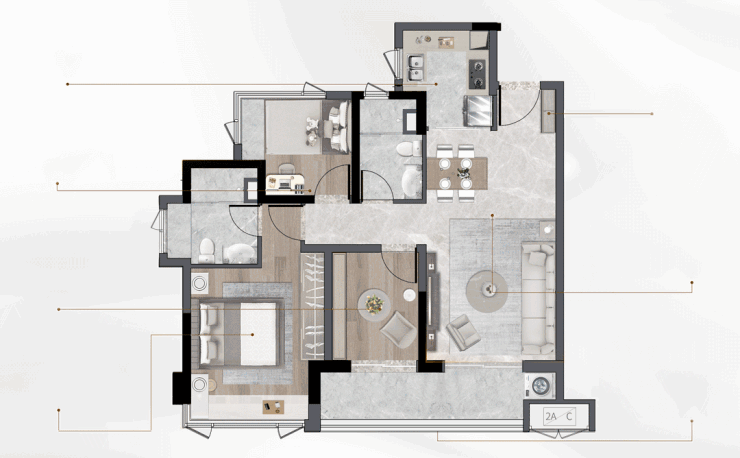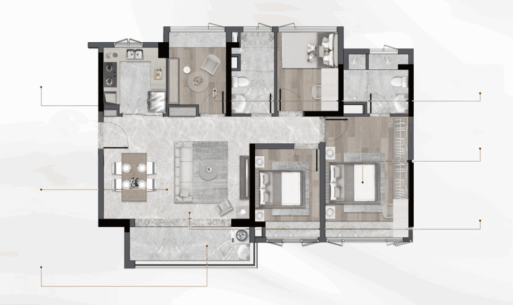 全明三房设计,三分离干湿分区卫生间...在功能布局中,最大化实现空间利用率,满足基础居住需求。为了最大化地利用一线滨海资源,设计师通过阳台-客厅-卧室观景相连,实现三面瞰海。
