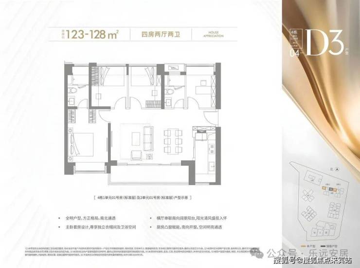 【建筑面积123-128㎡4房2卫】横厅南北通透格局,客餐厅6.6米开间,四开间朝南,主卧套房设计,6.6米超长观景阳台,得房率约72.45%(不含赠送),阳台主朝正南向。
