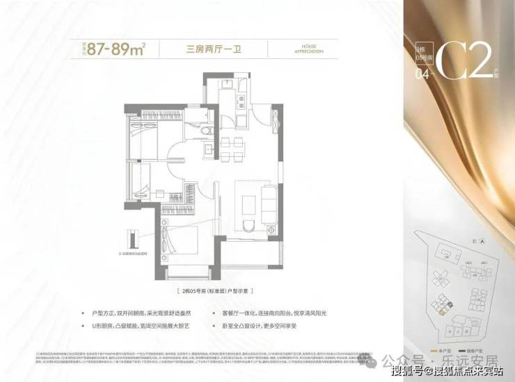 【建筑面积87-89㎡3房1卫】竖厅格局,进门入户玄关,客厅3.35米开间,LDKB一体化设计,进深7.2米,得房率约72.28%(不含赠送),西南或东南朝向。