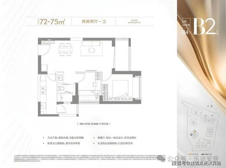【建筑面积72-75㎡2房1卫】竖厅格局,客厅3.2米开间,进深7.2米,一字型厨房还带1个生活阳台,卫生间三段式分离,得房率约72.28%(不含赠送),西南、东南或东北朝向。