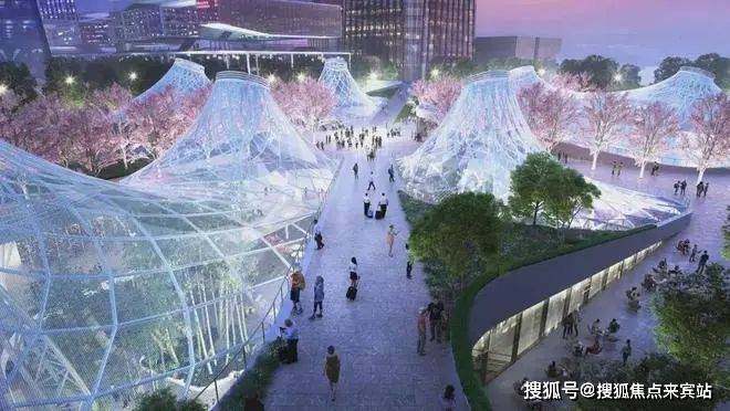 夜景光影与相交的花旗木大道配合,打造极具设计感的车站广场空间。