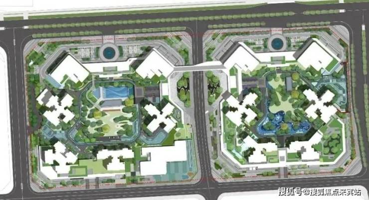 桂语汀澜分A、B两个地块开发,由空中连廊连接,属于围合点状式布局。此外还有中央绿地和社区配套,该有的都不缺。