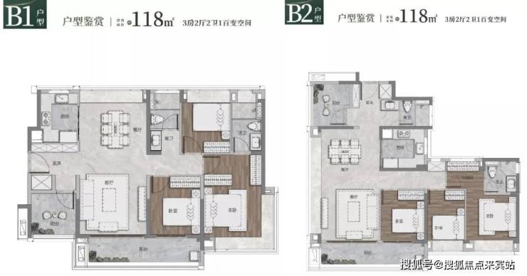 118平的B1和B2两个户型,最让人眼前一亮的是B2。