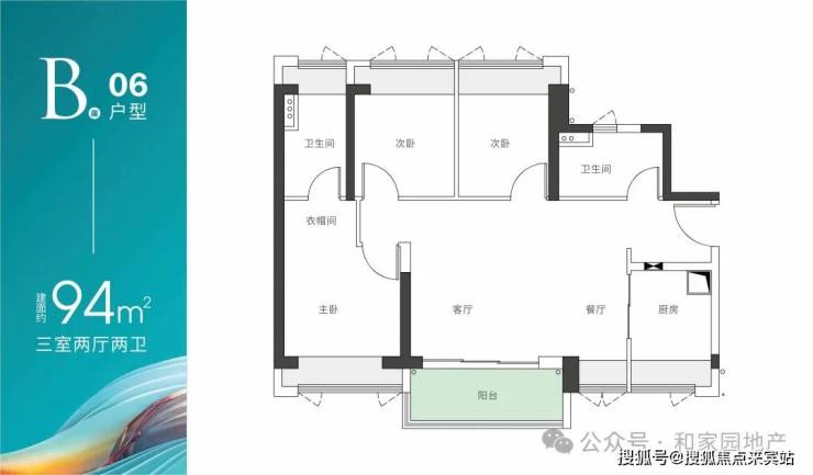 B座06户型-建面约94m² 三房两厅两卫