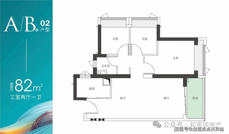 A/B座02户型-建面约82m² 三房两厅一卫