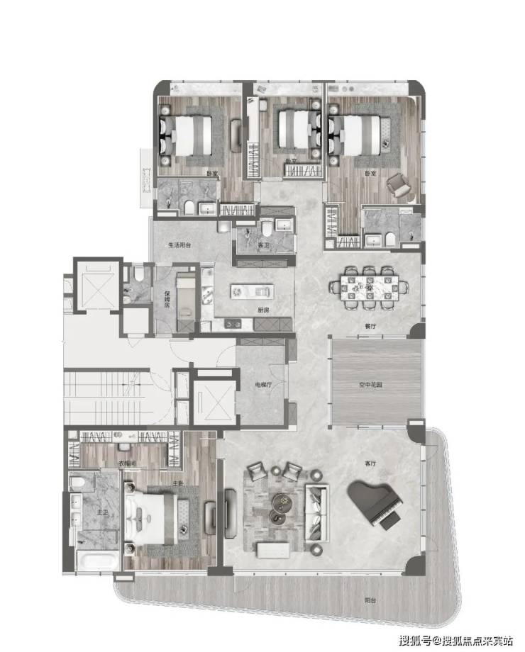 大平层采用的是单梯入户,户型的使用率非常高,我们首先来看看350㎡的大平层(5室2厅5卫),高层是带德系精装修交付的。