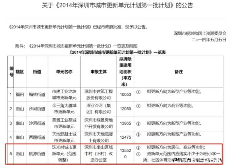 南山区桃源街道珠光村城市更新单元项目最早于2010年被纳入深圳市城市更新改造2010年度实施计划。而后,国土局公示《2014年深圳市城市更新单元计划第一批计划》,对拆迁重建用地面积进行了调整,达到了135520㎡。