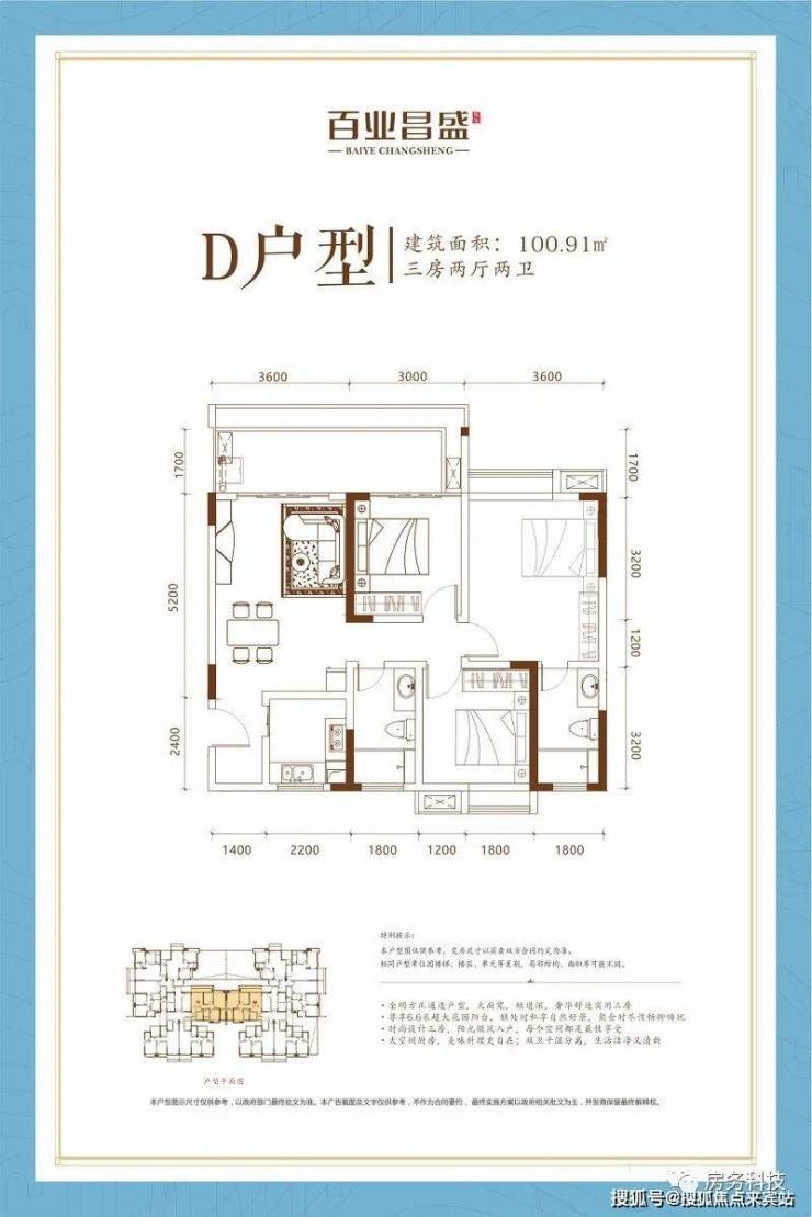 D户型 三房两厅两卫 建筑面积100.91㎡
