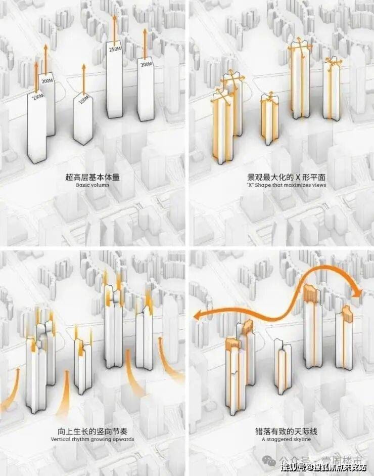 结合场地景观资源条件,团队提出一个反同质化的“X”形平面,作为住宅及公寓塔楼的平面原型。