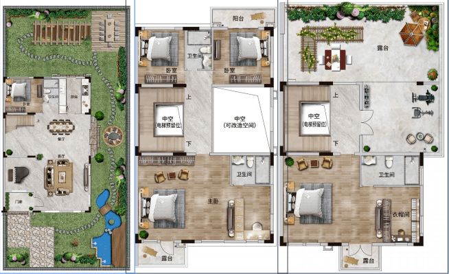 四联二层半,建筑基底卙地约100㎡,6.8米开间客厅面积:62㎡,三主套设计带约67-125㎡超大花园露台+中空赠送面积约50㎡